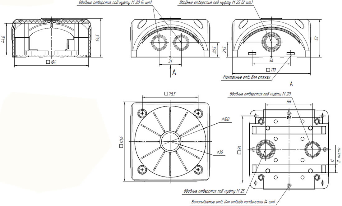 | Количество вводных отверстий | 5 шт. под муфту М20, 3 шт. под муфту М25 |